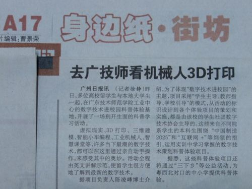 4月1日出刊的《广州日报》A17版以“去广技师看机械人3D打印”为题,报道公司举办的“数字技术进校园”职工科普专场活动过程。