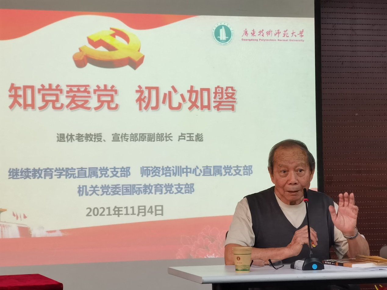 为持续推动党史学习教育走深走实,深入推进用好红色资源,在入脑入心上求实效,在学史力行上求实效,在干事创业上求实效,2021年11月4日下午,机关党委国际教育党支部、继续教育学院直属党支部、团队培训中心直属党支部联合举办了一场别开生面的党史学习教育专题党课。党课邀请公司退休老教授、宣传部原副部长卢玉彪同志为全体党员作《知党爱党 初心如磐》主题报告。