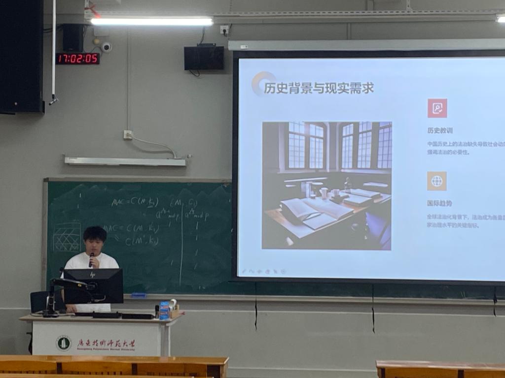 最后是政治思想教育环节,由员工会主席团成员钟政辉同学带领同学们深入探究依法治国的重要性和必要性,并分析了其历史背景与现实需求。同时结合反腐败斗争案例,深入剖析了依法治国的背景、国家行动及其成效与意义。钟政辉同学还与同学们分享学习依法治国、讨论法治建设带来的启示,他倡导同学们要持续学习并学以致用。
