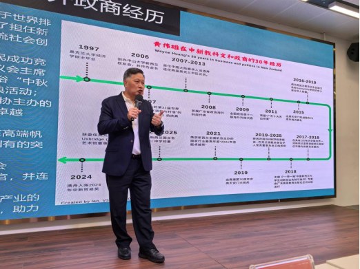 黄经理首先回顾了自己海外政商与教科文经历,强调体育赛事与文化活动在国际交流中的独特桥梁作用,如广东高校联盟羽毛球赛等。黄经理透露携舟科技有限公司正与江门市政府积极合作,将新西兰滨海产业的经验与大湾区对接,推动大湾区经济与文化融合发展,助力中新经贸和文化交流。