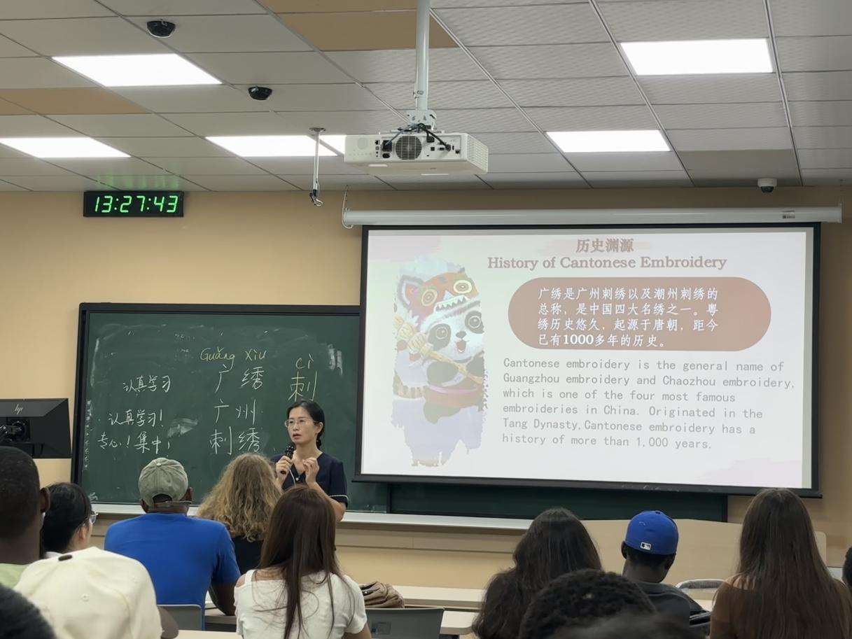 活动伊始,项目团负责人张艳教授通过中英双语课件,系统介绍了广绣作为国家级非物质文化遗产的历史脉络与艺术特征,并重点阐述了广绣书签在设计中所融入的全运会体育元素与广州地标文化符号,帮助中外员工理解活动主题与创作意图。