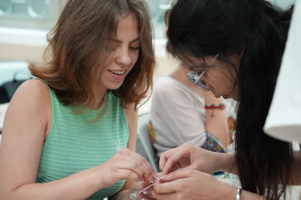 在实践环节中,团队志愿者为参与者分发了绸缎、丝线与绣具,并现场演示广绣基本针法。中外员工在团队志愿者“一对一”指导下,学习如何绣制以全运会标志和广州塔为原型的两类书签。尽管多数职工是首次接触广绣,仍表现出高度的专注与热情,现场学习氛围浓厚,互动积极。