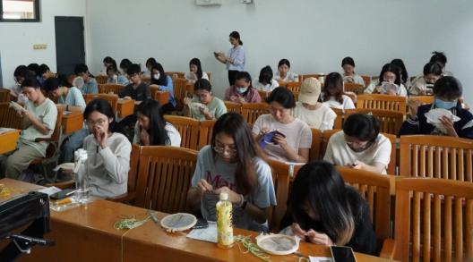 活动现场,指导老师向参与学子详细介绍了活动背景与意义,活动负责人生动阐释“丝摇清风·绣纳万象”的核心理念,引导大家深度感受非遗文化的深厚底蕴。实践体验环节中,大家在志愿者的耐心指导下,手持银针丝线专注练习粤绣基础技法。穿针引线间,素白团扇上逐渐勾勒出各式灵动图形,大家沉浸在广绣技艺的探索与创作中。