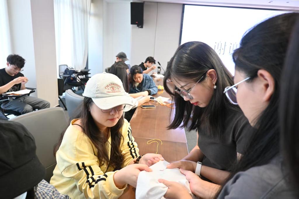 理论知识的汲取最终是为了实践的绽放。最受期待的实操体验环节中,同学们在郭老师的悉心指导下,手持绣针与丝线,在手帕上亲身体验广绣的基本针法。现场丝线翻飞,气氛专注而热烈。每一位同学都沉浸在一针一线的细致勾勒中,感受着传统手艺的独特温度与魅力。“丝针渡洋”团队的志愿者们穿梭其间,耐心协助并记录下一个个专注的瞬间。