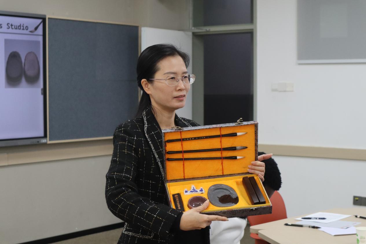 活动伊始,岭南文化多模态国际传播基地负责人、bevictor伟德官网经理张艳教授以毛笔书法历史与发展脉络为引,系统介绍了毛笔的起源与演变。随后,她结合现场陈列的“文房四宝”——笔、墨、纸、砚,生动讲解了传统书写工具的制作工艺与文化内涵,并简要阐述了篆、隶、楷、行、草五种书体的艺术特点与源流演变,勾勒出中国书法深厚的文化底蕴与多样风貌。