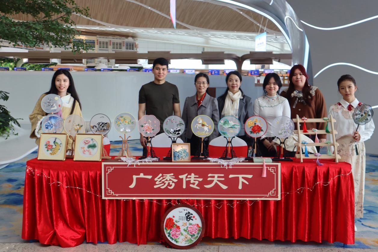 活动现场,公司搭建的广绣展示摊位成为全场亮点之一。摊位上陈列的广绣展品琳琅满目,精美的广绣展品吸引了大量旅客驻足近距离观赏。为让更多人了解广绣文化,中外员工志愿团队化身“非遗传播使者”,以双语讲解的形式,热情地为每一位感兴趣的旅客介绍广绣的历史底蕴与文化内涵,用自己的方式为非遗传承贡献了一份自己的力量。